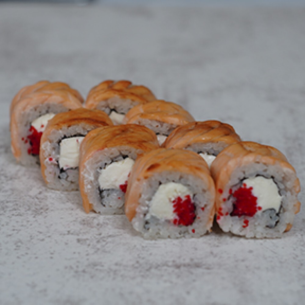 Рис, водоросли нори, сливочный сыр, икра тобико, лосось