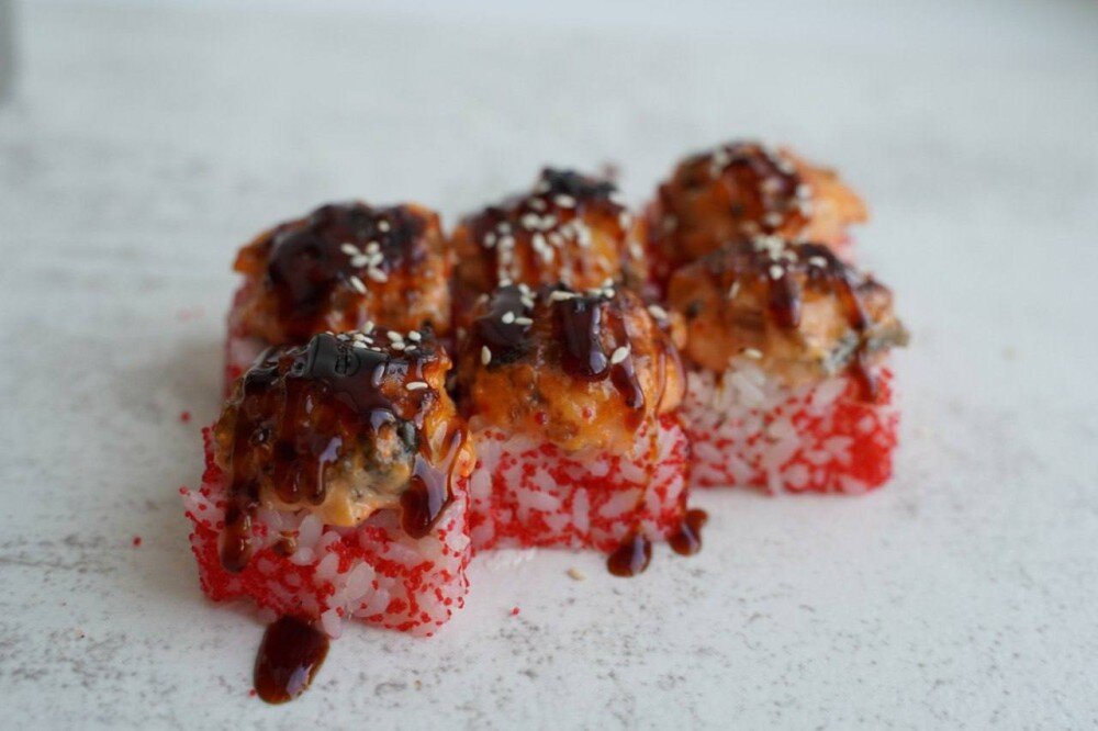сливочный сыр, икра масаго, копченый угорь, розовый соус