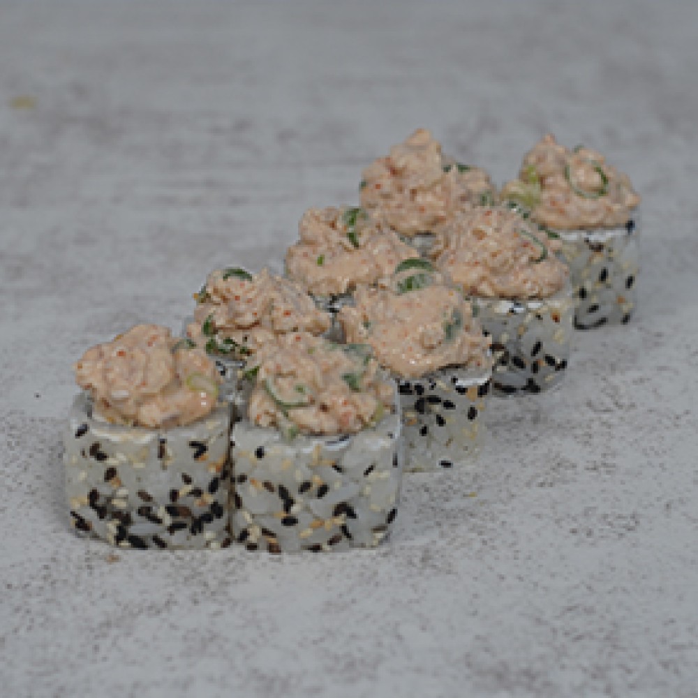 Рис, сливочный сыр, водоросли нори, зелёный лук, спайси соус, курица, кунжут